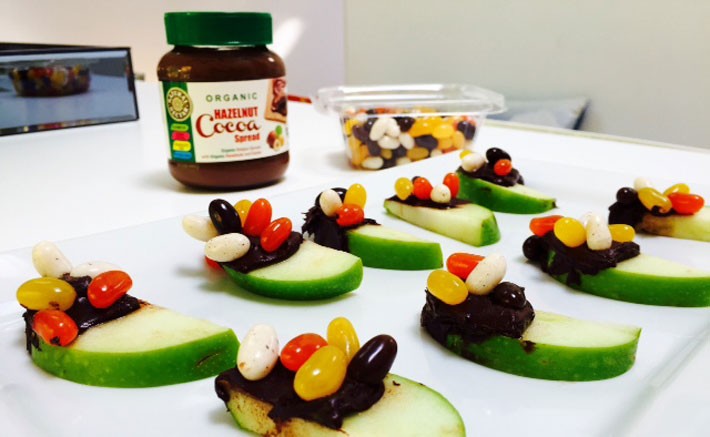 Candy Apple Bites Recipe- that is so easy and a fun thing to make with the whole family. Grab chocolate spread, apples, and candy and we are ready for a no-bake comfort food dessert recipe. www.ChopHappy.com